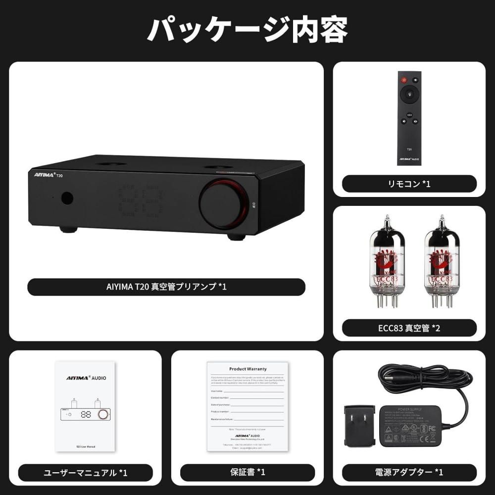 本体、取扱説明書、ECC83真空管×2本、電源アダプタ、リモコン。