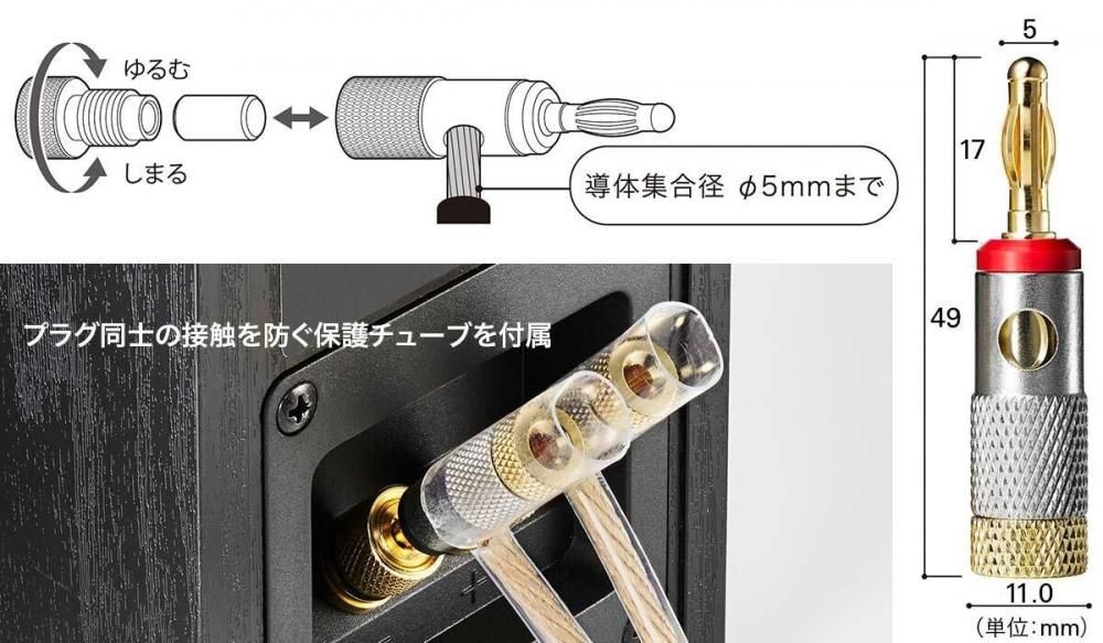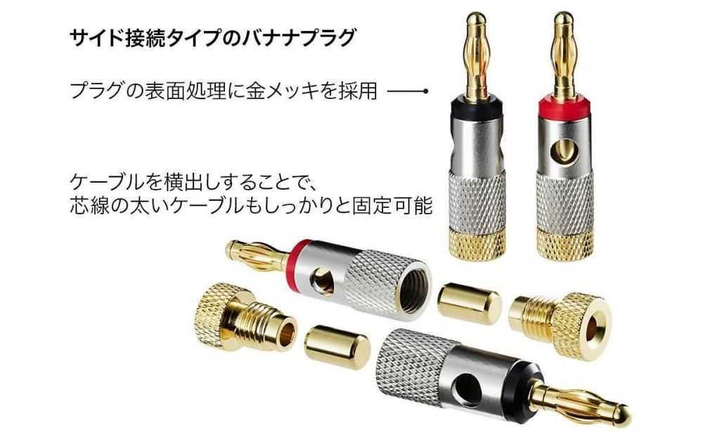 導体集合径5.0mmまでのスピーカーケーブルに対応。サイド接続タイプのバナナプラグ