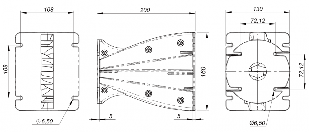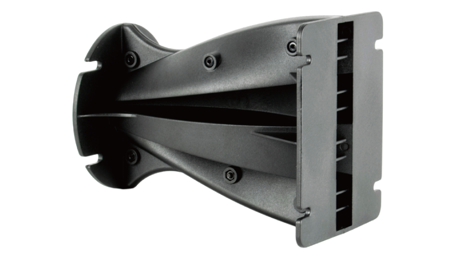 この新型ホーンは高さ6.3インチ、スロート径1.4インチの設計。高強度強化ポリカーボネート製2ピース構造で、M6ネジ穴によってドライバーの取り付けと筐体接合を可能とします。FEM解析により、矩形開口部が全表面で均一かつ等位相のSPLを実現しました。