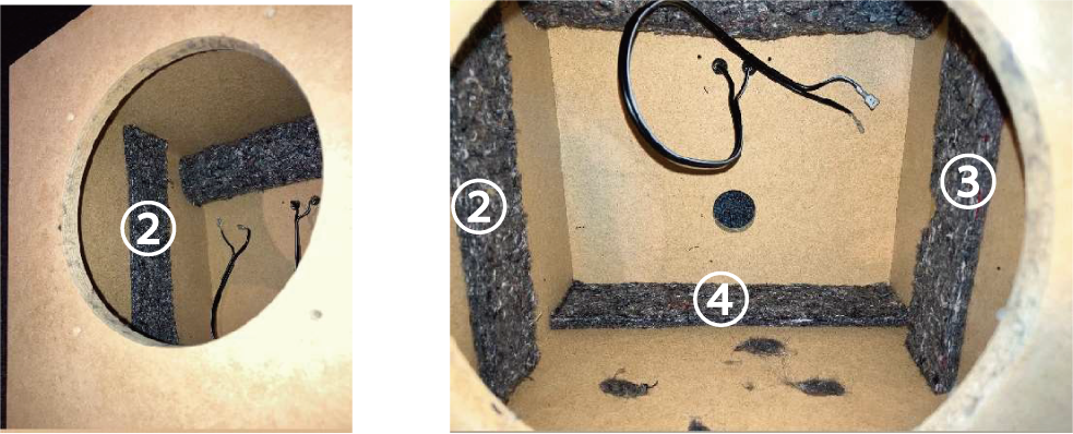 ③は右側面中央に縦方向に貼ります。⑤を底面に貼って吸音材の貼り付けは完了です。