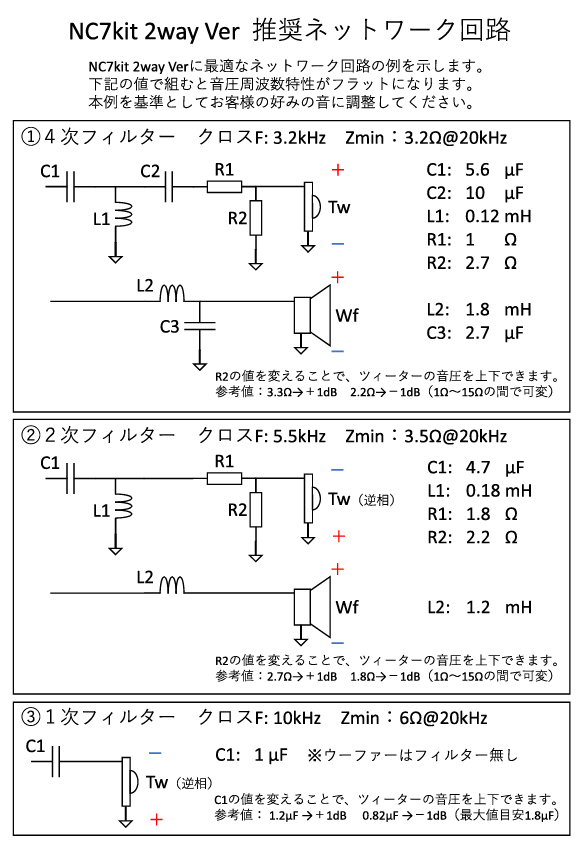 また、なかなか難しいマルチウェイのネットワーク設計に不安のある方もいらっしゃると思いますが、この商品はエンジニアが想定しているネットワーク回路図が商品ページに掲載されているので、値に合わせて適合するコンデンサやコイルを買っていただければ比較的簡単にネットワークを組むことができます。