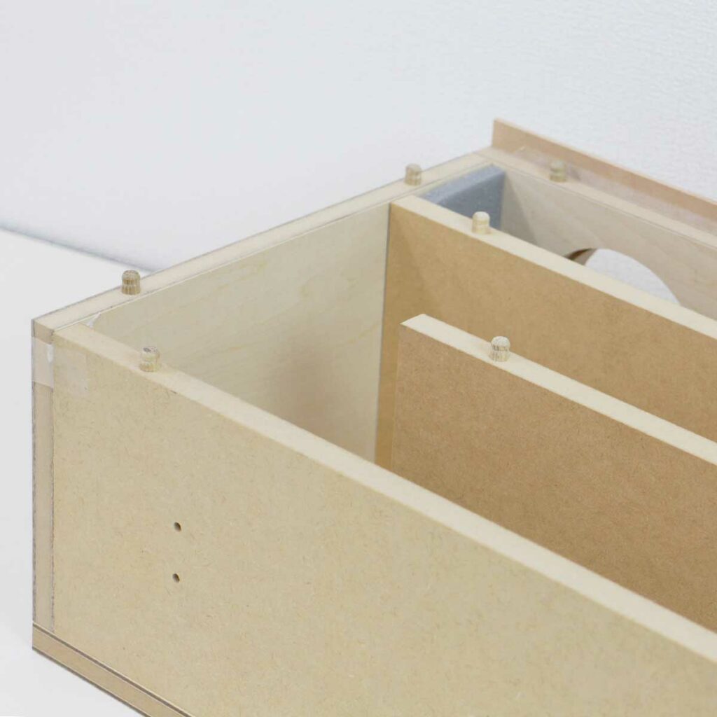 エンクロージャーの組立ては板材に差し込みができるように落とし込み加工がされているので、非常に行いやすいです。
